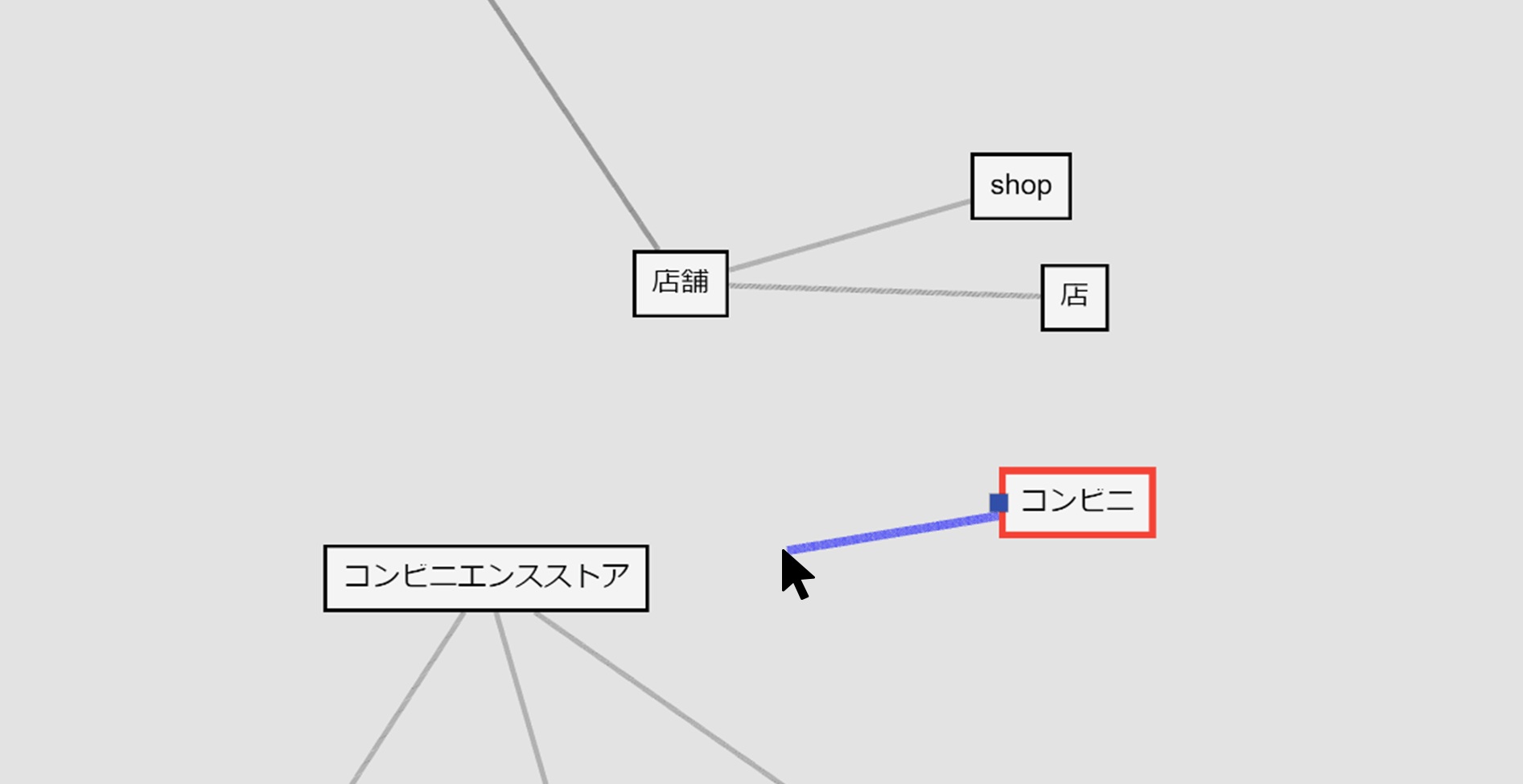 ”コンビニ”にポインタを合わせて表示された3つのポイントのうち、左右のポイントのいづれかの上でマウスボタンを押し下げたままドラッグすると、同義関係線を引き出すことができます。