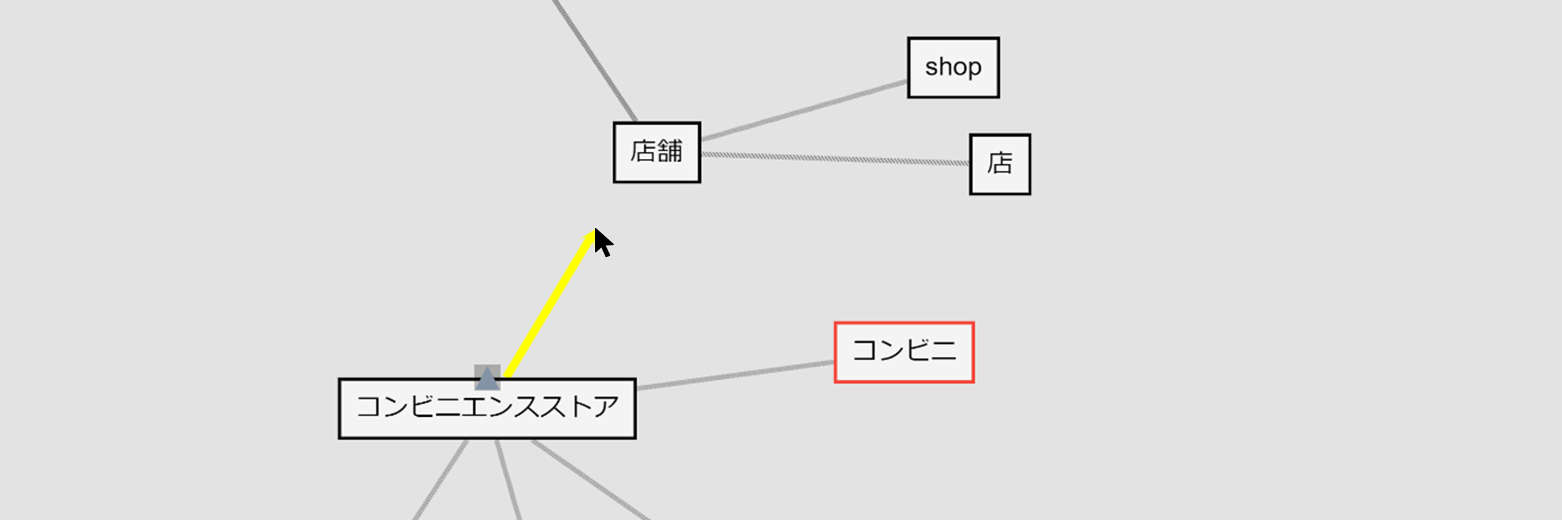 次のように、”コンビニ”と”コンビニエンスストア”がグレーの線で結ばれました。このグレーの線が同義関係線です。