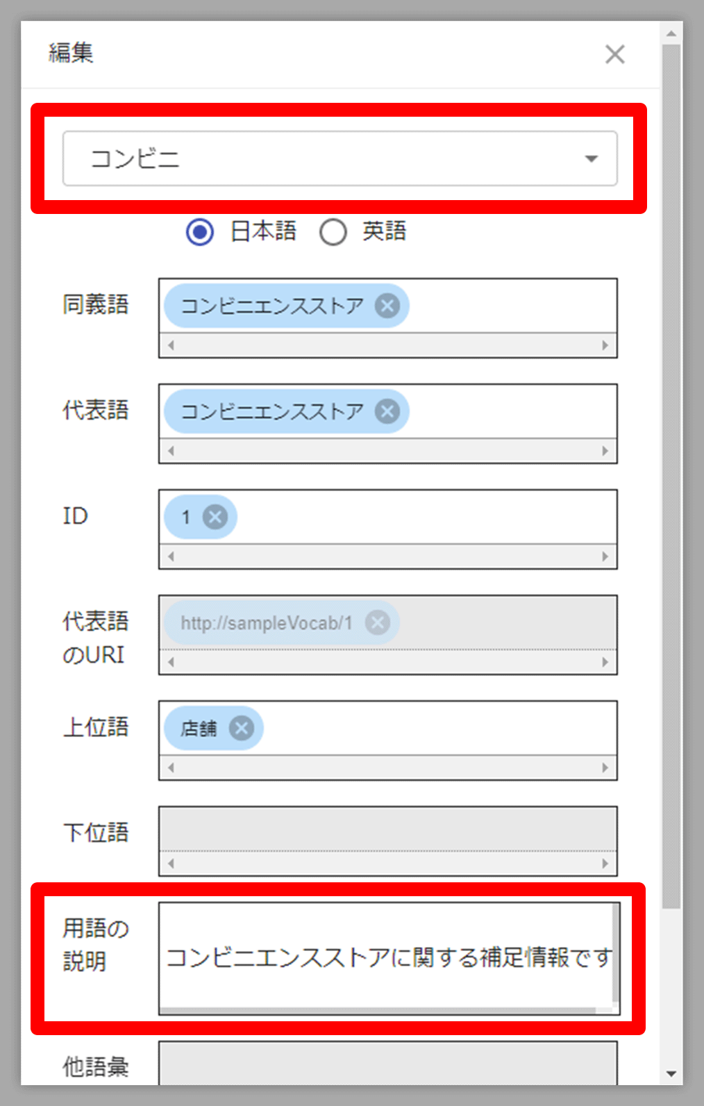 編集パネルでは、IDを編集することで代表語のURIを変更したり、用語の説明を編集することもできます。