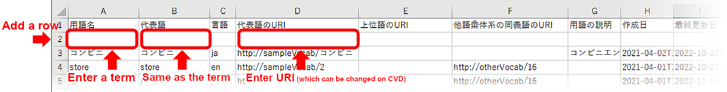 Edit the exported Editing Vocabulary (編集用語彙) file. To add a synonym in another vocabulary system to a term in the exported CSV file, enter the URI of the synonym in the “URI of synonym in other vocabulary systems (他語彙体系の同義語のURI)” Column.